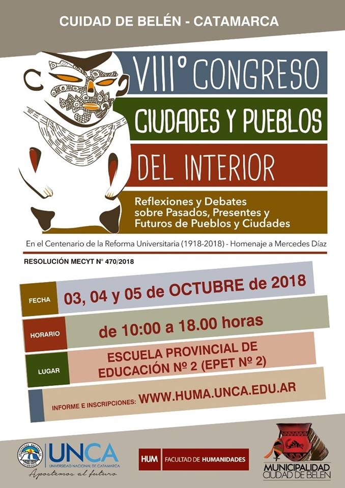 La Facultad de Humanidades de la UNCA invita a la comunidad universitaria y público en general a participar este jueves 20 de septiembre de la conferencia de prensa que se realizará en el Salón Amarillo de la Universidad Nacional de Catamarca a las 10 de la mañana por el VIII Congreso de Ciudades y Pueblos del Interior: Reflexiones y Debates sobre pasados, presentes y futuros de Pueblos y Ciudades - En el Centenario de la Reforma Universitaria (1918-2018)- Homenaje a María Mercedes Díaz.