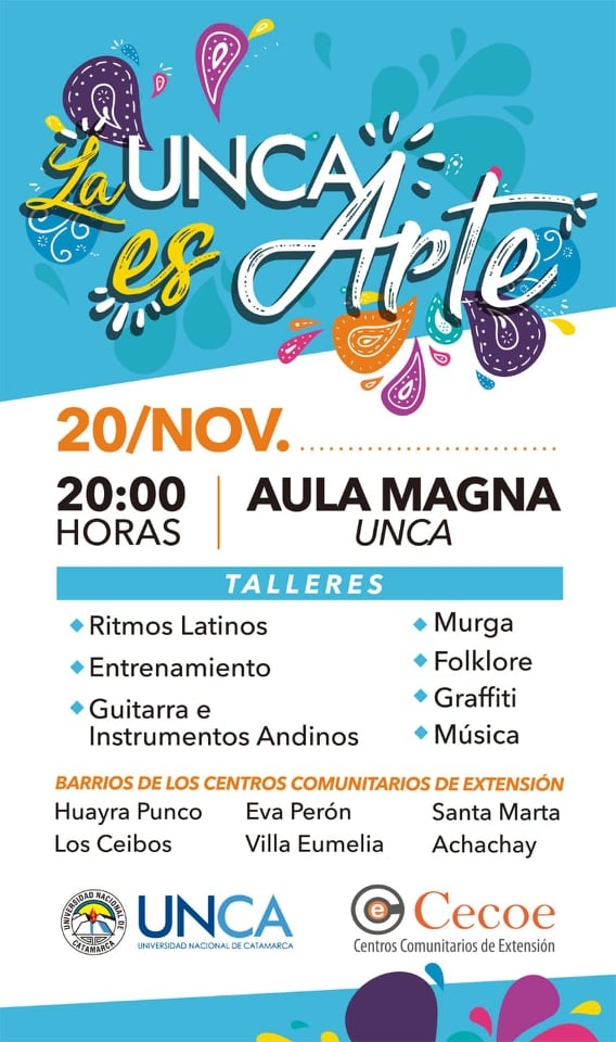 Bajo el lema “La UNCA es arte”, se realizarán presentaciones de los talleres de Ritmos Latinos, Entrenamiento, Guitarra e Instrumentos Andinos, Murga, Folklore, Graffitti y Música y la entrada es libre y gratuita.