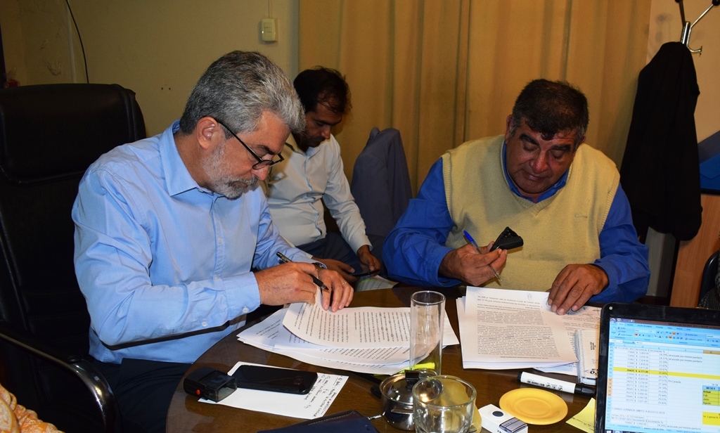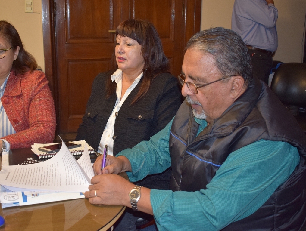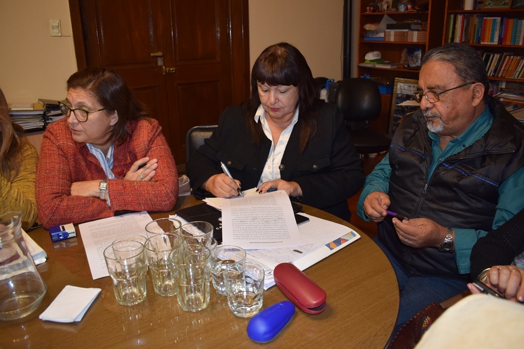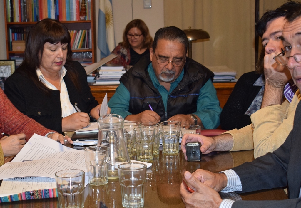 El ministro de Educación, Daniel Gutiérrez, el subsecretario de Finanzas, Ariel Luna, la subsecretaria de Gestión Educativa, Olga Burella y los representantes de los gremios docentes, Juan Godoy por SUTECA, Nancy Agüero por UDA, Sergio Guillamondegui por SIDCA, Silvia Bustamante por SADOP, Mario Sánchez por ATECA y Olga Ponce de León por ADUCA llegaron a un acuerdo en la paritaria docente provincial.