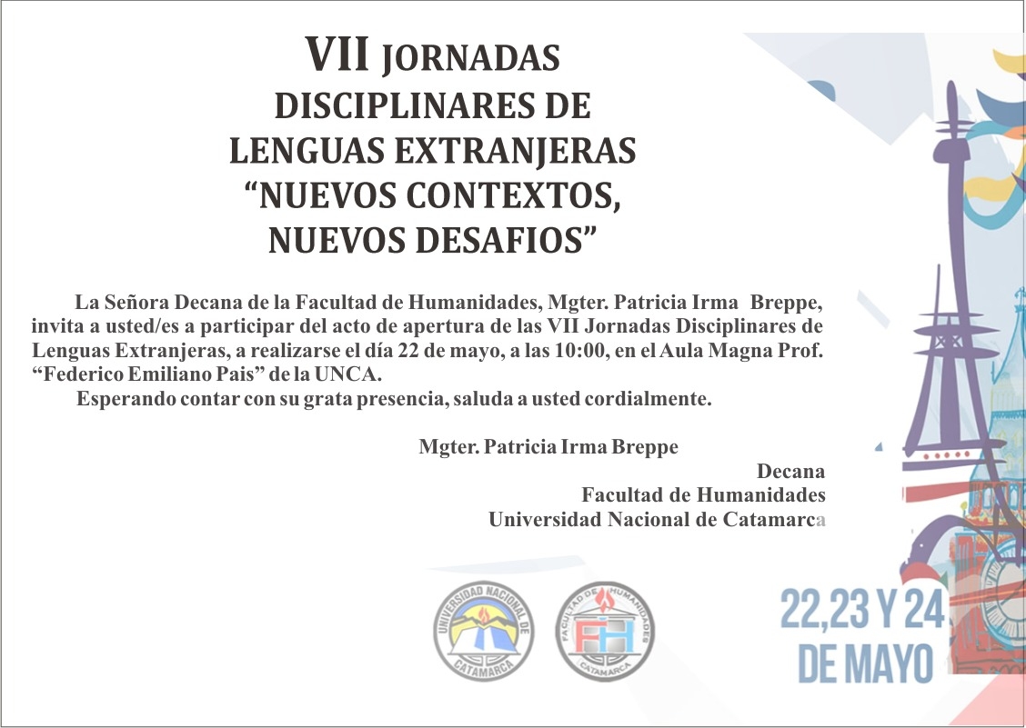 Organizadas por los Departamentos de Inglés y Francés de la Facultad de Humanidades de la UNCA, las VII Jornadas Disciplinares de Lenguas Extranjeras “Nuevos contextos, nuevos desafíos” se desarrollarán entre el miércoles y viernes de esta semana en distintas dependencias de la Universidad.