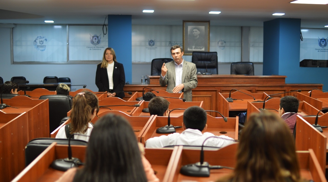 Camino al juramento a la Constitución Nacional y Provincial prevista para el próximo 14 de mayo, alumnos de 6° grado de la Escuela N°428 “Dr. Enrique Ocampo” de la ciudad Capital, visitaron esta mañana el Palacio Legislativo donde fueron recibidos por el senador Jorge Moreno y autoridades de la Cámara Alta.