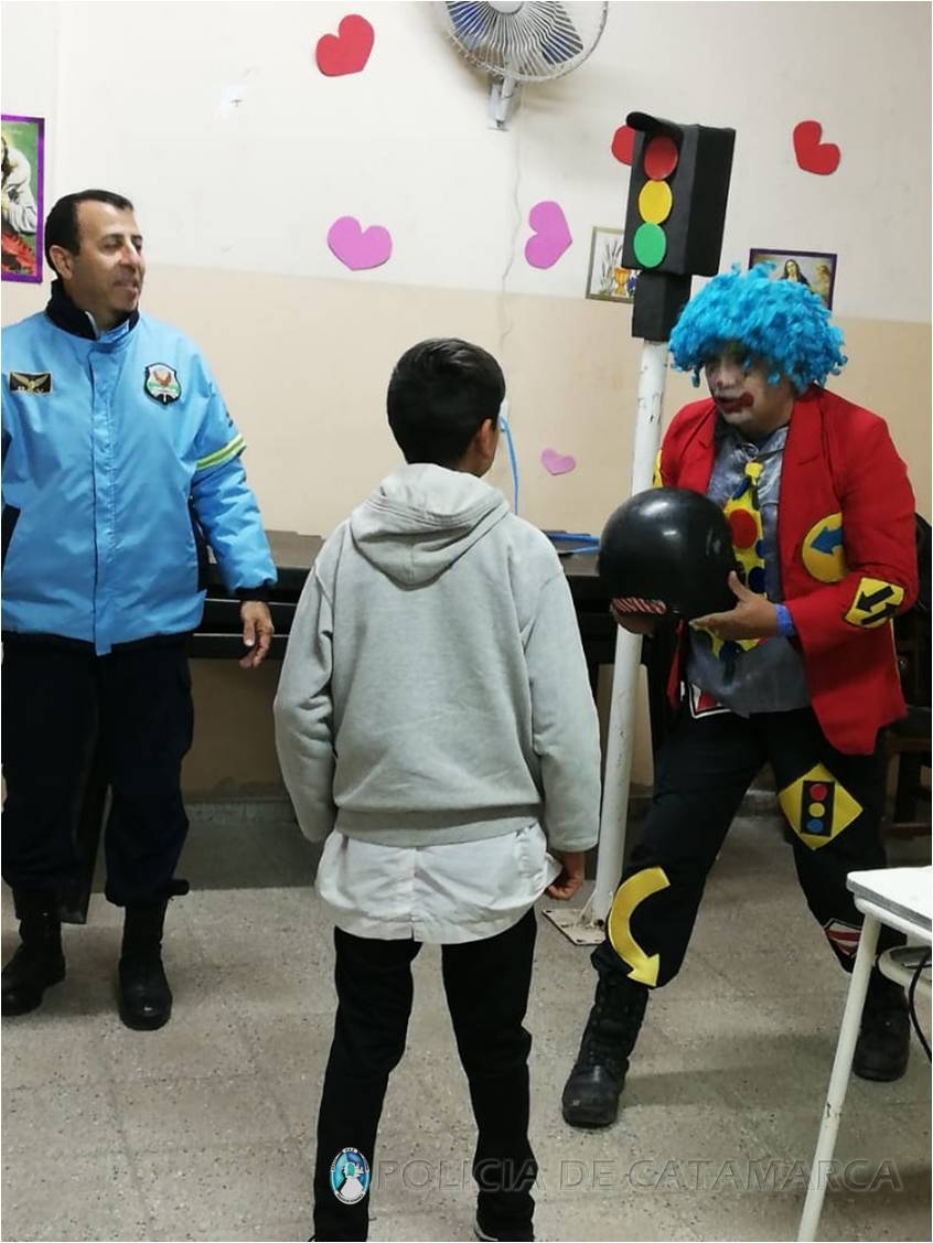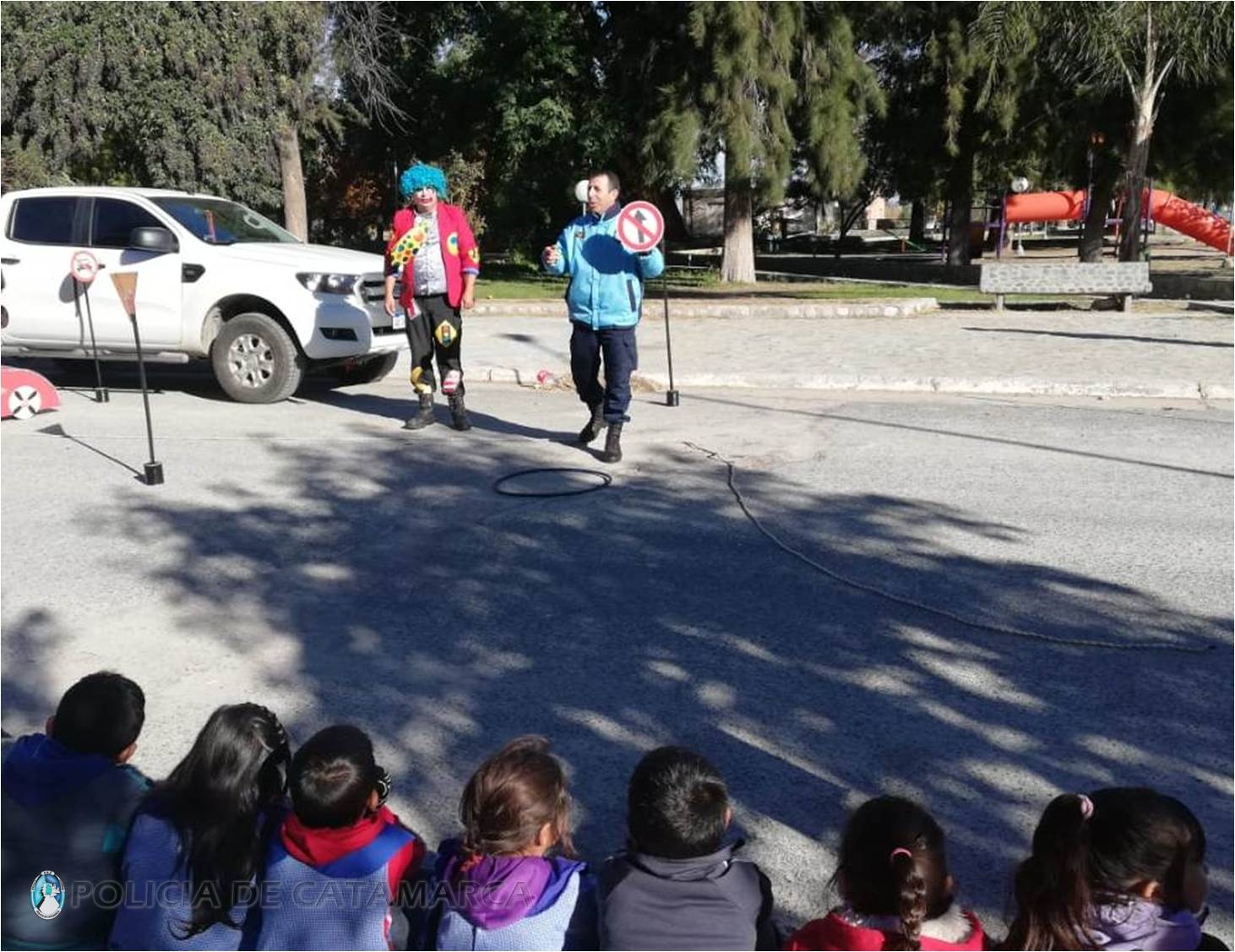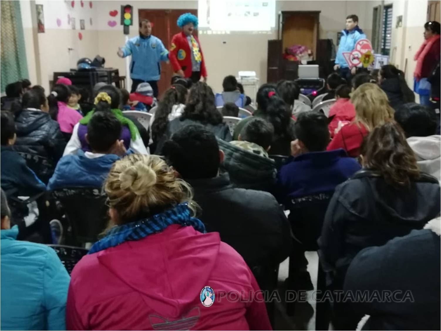Durante la mañana de este martes, efectivos del Gabinete de Docencia y Capacitación, perteneciente a la Dirección Seguridad Vial de la Policía, llegaron hasta el JIN N° 16 y la Escuela N° 392 “Daniel de Jesús Ovejero”, de la localidad de Siján, departamento Pomán.
