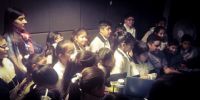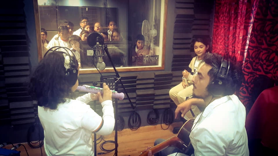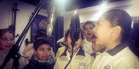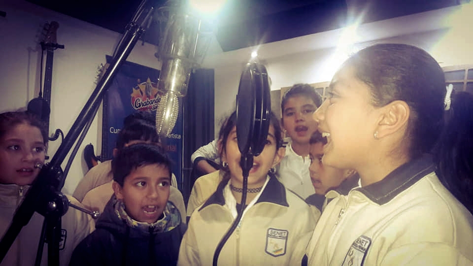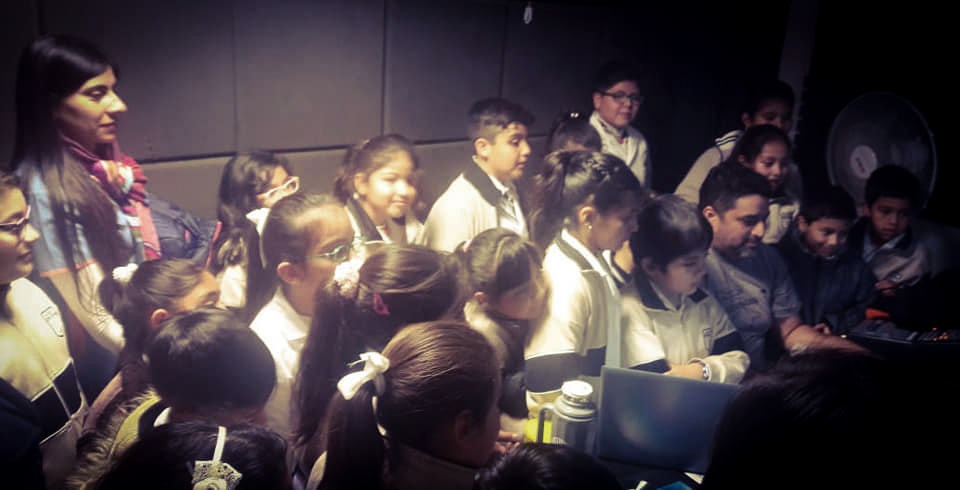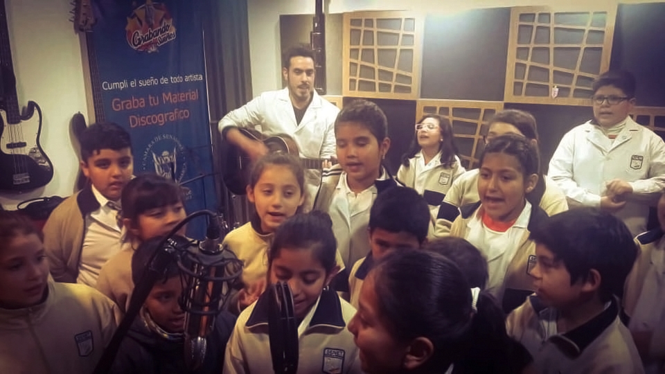 Acompañados por la Directora del Colegio Teresita Vega; sus profesores, Juan Manuel Cutuli Rojas, Valeria Dávila, Verónica Robledo, y la licenciada Emilia Ruiz; los estudiantes fueron recibidos por el coordinador del Estudio Miguel Guerrero y el equipo técnico, quienes les explicaron las posibilidades que les ofrece el espacio, mientras los pequeños se animaron a cantar, y con mucho entusiasmo, ya proyectan un disco.