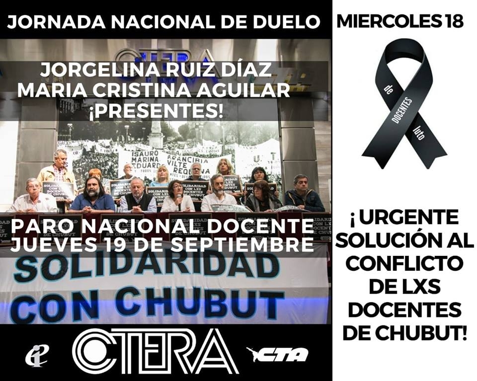 El paro nacional de mañana convocado por CTERA es en solidaridad al fallecimiento de las dos docentes Jorgelina Ruiz Díaz y María Cristina Aguilar, quienes perdieron la vida en la provincia de Chubut en un accidente automovilístico, cuando regresaban a su localidad luego de participar de una marcha de protesta.