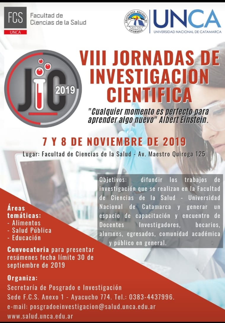 Las jornadas se llevarán a cabo en la Facultad de Ciencias de la Salud, ubicada en la Universidad Nacional de Catamarca, sobre avenida Maestro Quiroga N° 125 los días 7 y 8 de noviembre de 2019 y la convocatoria para presentar resúmenes tiene fecha límite hasta el 30 de Septiembre.