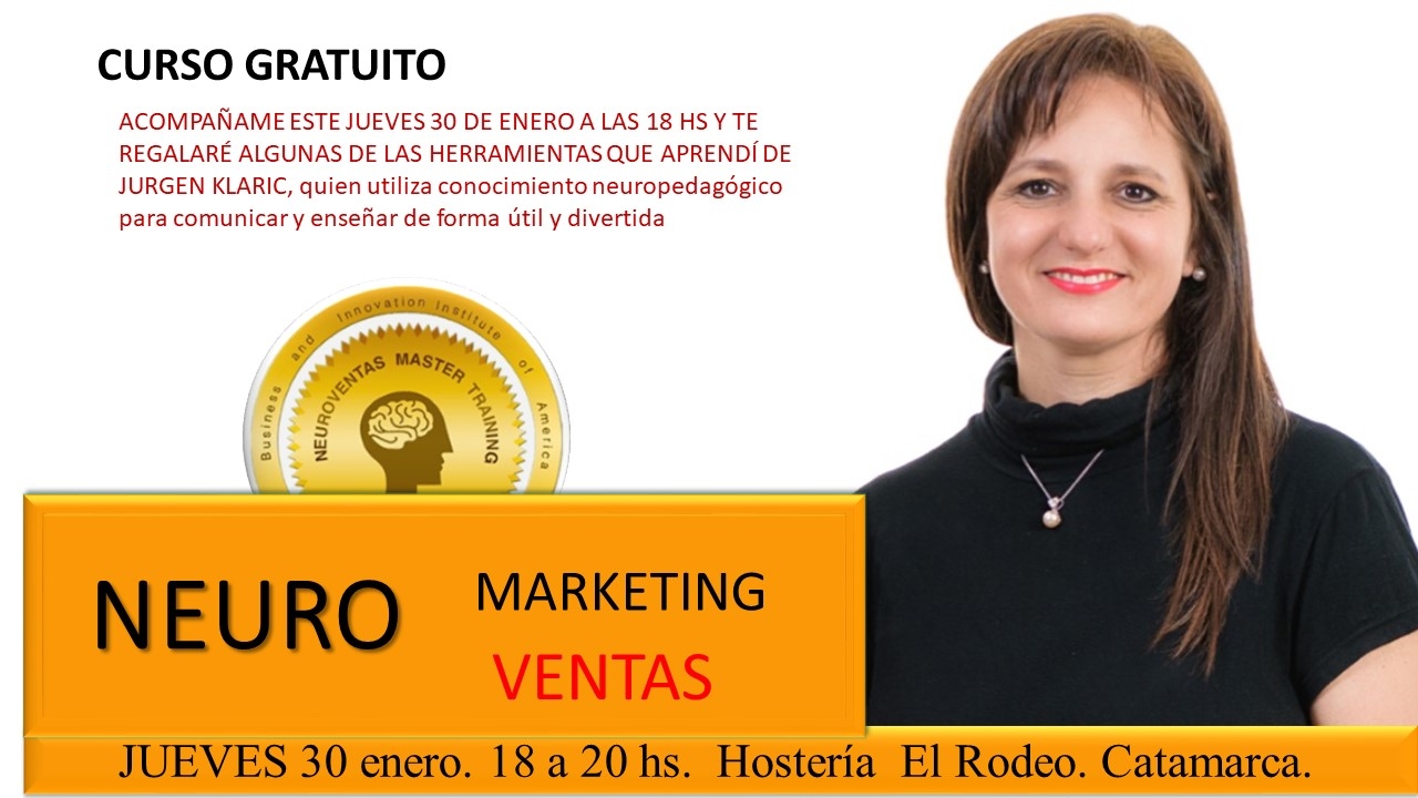 El jueves 30 de 18 a 20 en Hostería de El Rodeo se dictará un curso gratuito de Neuro Marketing . Te llevarás herramientas para incorporar a tu negocio o empresa y hacer crecer tus ventas. Inscripciones en Cantarell Consultoría. Consultas al teléfono 3834263133.