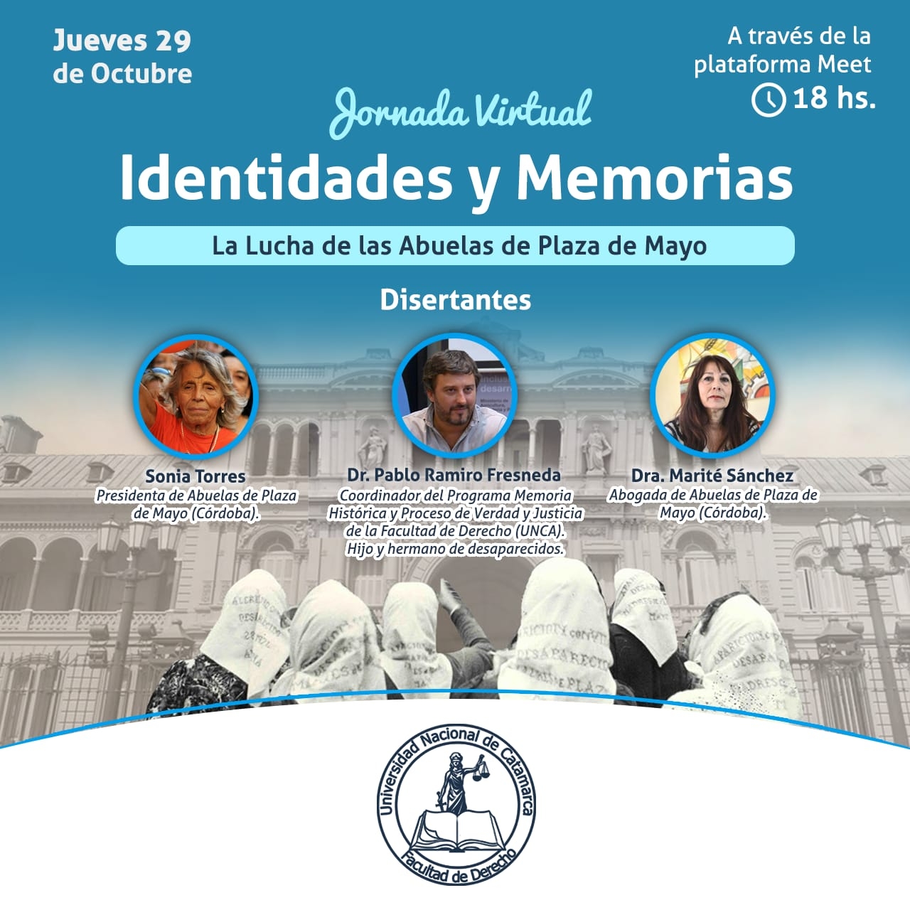 La disertación estará a cargo del coordinador del programa Memoria Histórica y Proceso de Verdad y Justicia, Dr. Pablo Ramiro Fresneda, quien estará acompañado por Sonia Torres, y la Dra. Marité Sánchez de Abuelas de Plaza de Mayo de Córdoba.