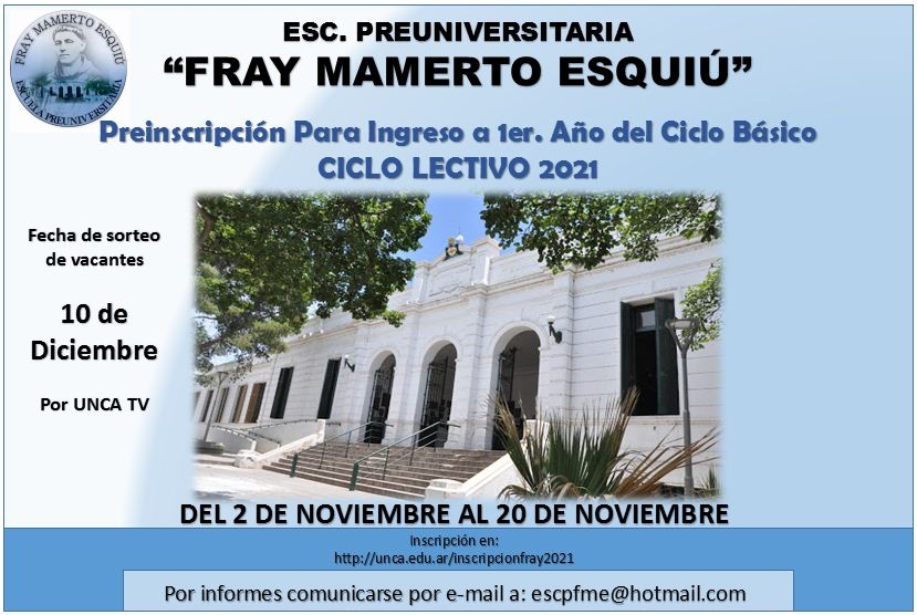 La Escuela Preuniversitaria Fray Mamerto Esquiú comunica que el próximo lunes 2 de noviembre abren las preinscripciones online para el ingreso del 1° año Ciclo Básico del Nivel Secundario- Ciclo Lectivo 2021.