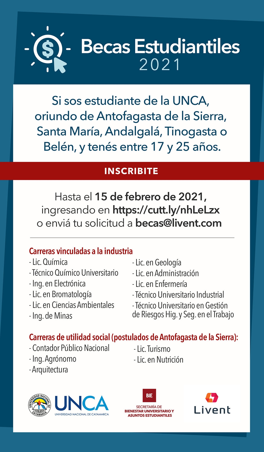 Podrán inscribirse los estudiantes oriundos de Antofagasta de la Sierra, Santa María, Belén, Andalgalá o Tinogasta, que tengan entre 17 y 25 años, de las carreras vinculadas a la industria: