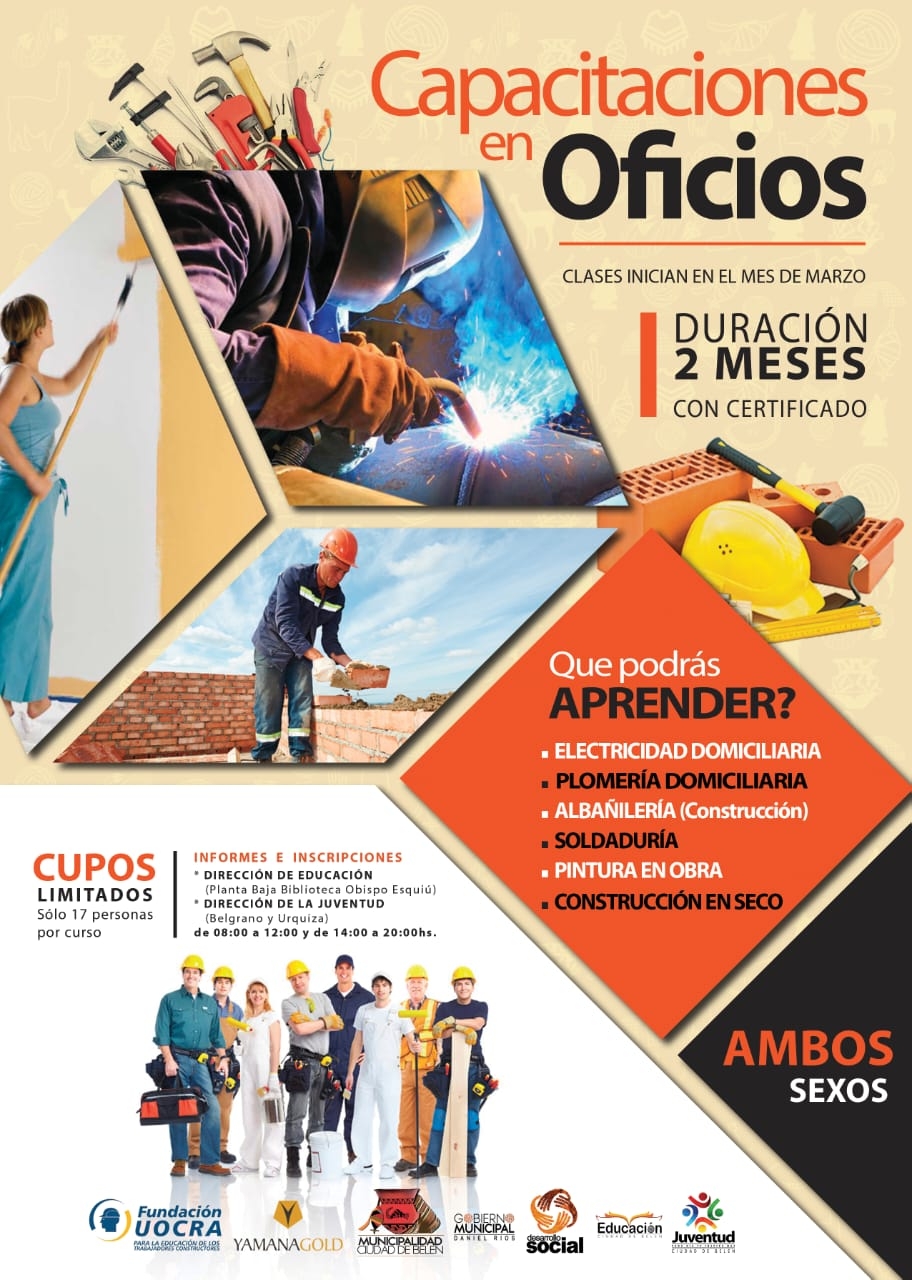 A través de un Convenio firmado entre la Fundación UOCRA (Unión Obrera de la Construcción de la Rep. Argentina) como como entidad ejecutora, Agua Rica como financiadora y la Municipalidad de Belén como receptora, se logró implementar Cursos de Capacitación en Oficios a dictarse a partir del mes de marzo.