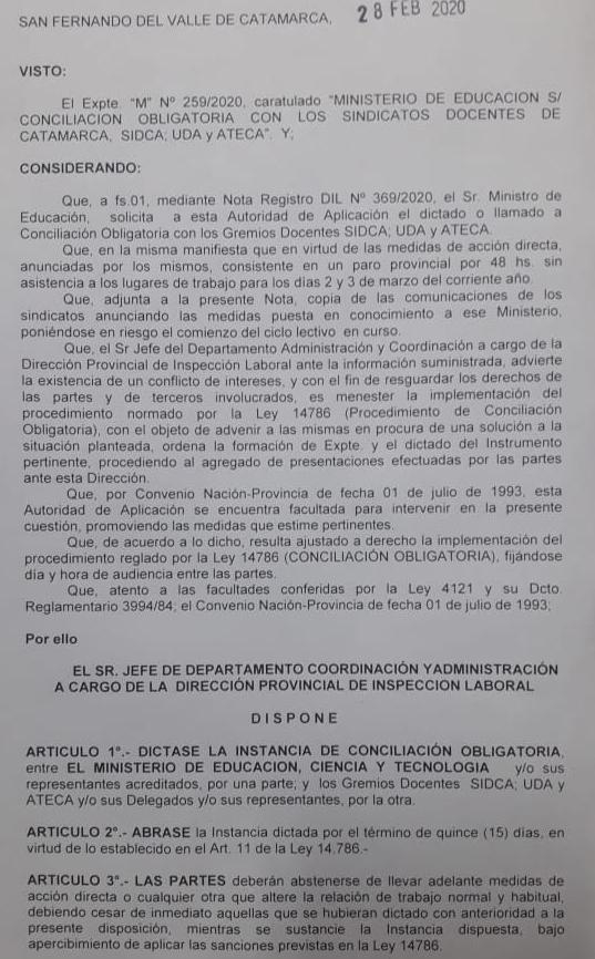 La misma, dispone la conciliación obligatoria entre el Ministerio de Educación de la provincia y los gremios docentes SIDCA, UDA y ATECA, abriéndose de esta manera una instancia de diálogo por el término de quince días.