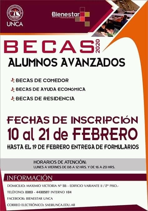 La Secretaría de Bienestar Universitario y Asuntos Estudiantiles de la UNCA, informa a los alumnos avanzados de 2° año en delante de todas las carreras, que del 10 al 21 de febrero estarán abiertas las inscripciones para las Becas Comedor, Becas Residencia y Becas de Ayuda Económica 2020.