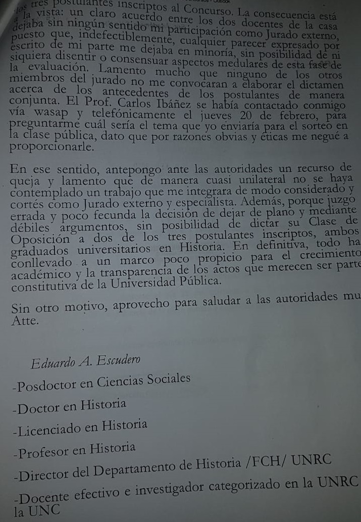 Por ello, Escudero presentó formalmente un recurso de queja en el que, además, califica de "errada y poco fecunda la decisión de dejar de plano y mediante débiles argumentos, sin posibilidad de dictar su clase de Oposición a dos de los tres postulantes inscriptos, ambos graduados universitarios en Historia".