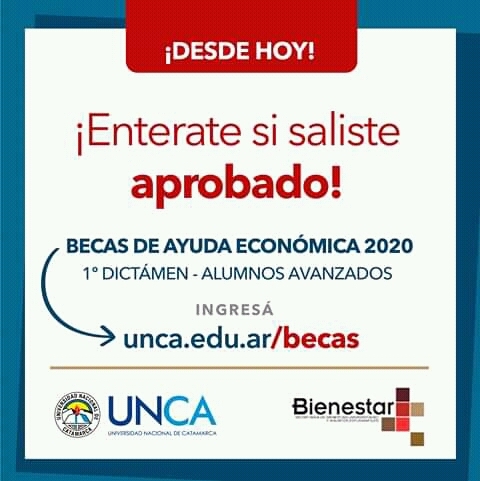 La Secretaría de Bienestar Universitario y Asuntos Estudiantiles de la UNCA comunica a los alumnos avanzados que se hayan inscripto como aspirantes a las Becas de Ayuda Económica- período 2020 que, desde hoy, lunes 20 de abril, están publicados los resultados del Primer Dictamen, ingresando con su DNI al link unca.edu.ar/becas