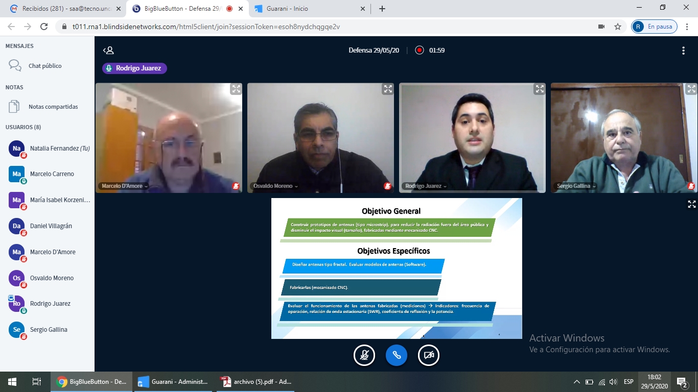 Juárez, presentó su tesis “Desarrollo de prototipo y medición de antenas patch con impacto ambiental reducido utilizando CNC”, ante el jurado conformado por el Ing. Sergio Hilario Gallina, Ing. Osvaldo Daniel Moreno, Ing. Marcelo Luis D’amore y el Ing. Luis Daniel Villagrán(suplente).