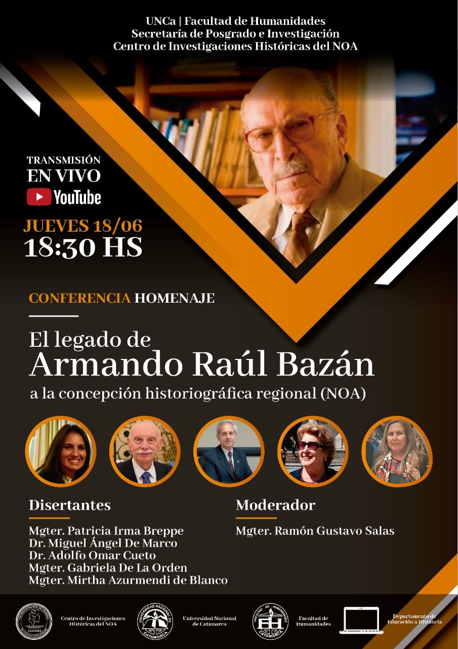 La Secretaría de Posgrado e Investigación de la Facultad de Humanidades de la UNCA y el Centro de Investigaciones Históricas del NOA organizan una conferencia homenaje virtual a Armando Raúl Bazán, al conmemorarse un año de su fallecimiento, ocurrido el 20 de junio de 2019.