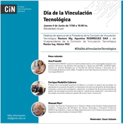 El mismo contará con la participación de la Presidenta del CONICET, Dra. Ana Franchi, el Profesor de la Universidad Autónoma de México y el Consultor en Vinculación tecnológica, Dr. Enrique Medellín Cabrera, y el Consultor del Ministerio de Ciencia, Tecnología e Innovación Productiva (MINCYT), Dr. Manuel Marí, quienes disertarán sobre la temática.