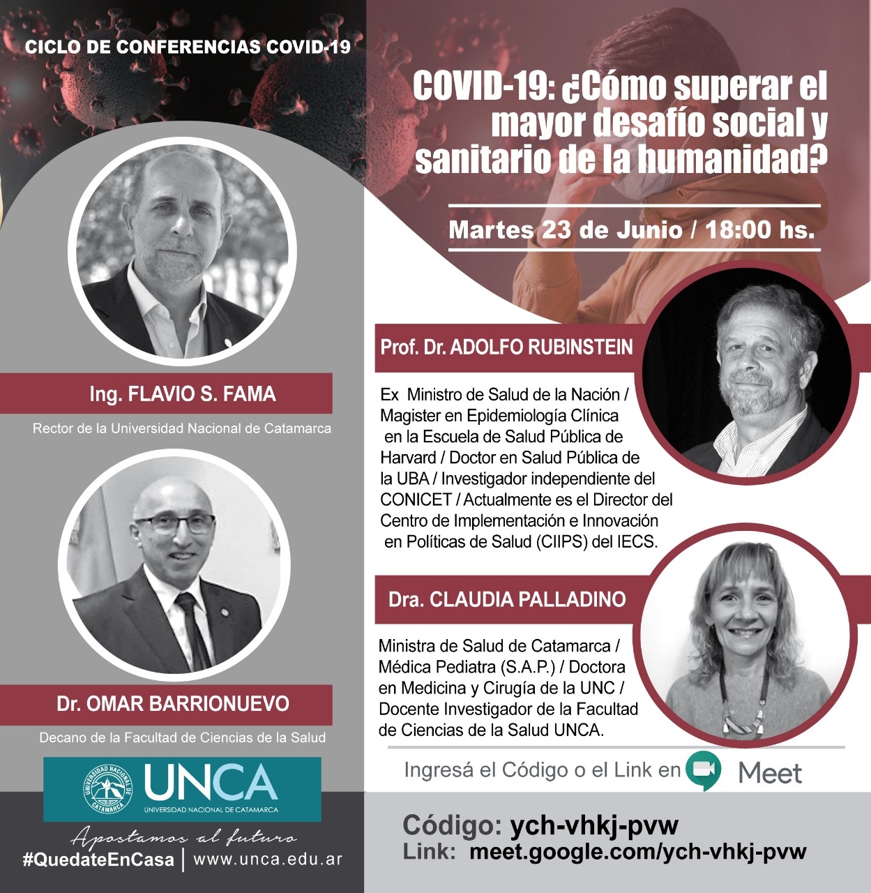 La disertación, titulada ¿Cómo superar el mayor desafío social y sanitario de la humanidad?, será presentada y moderada por el rector de la UNCA, ing. Flavio Fama junto al decano de la facultad de Ciencias de la Salud, Dr. Omar Barrionuevo.