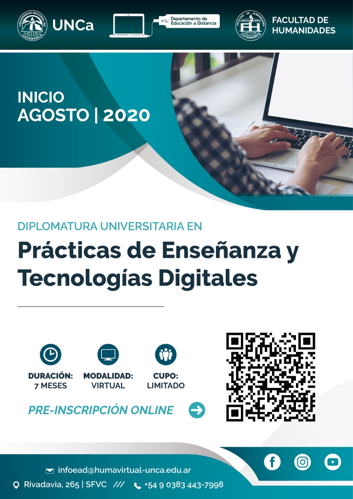 El Departamento de Educación a Distancia de la Facultad de Humanidades dictará, a partir del 3 de agosto, la Diplomatura en Prácticas de Enseñanza y Tecnologías Digitales. Está dirigida a personas que tangan título de grado habilitante para la docencia (cuyo plan académico sea de cuatro años o más, o en su defecto, certificación de servicio en la docencia de nivel secundario y/o superior).