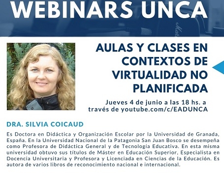Esta vez la propuesta titulada “Aulas y Clases en Contexto de Virtualidad No Planificada”, a cargo de la Dra. Silvia Coicaud, doctora en Didáctica y organización Escolar por la Universidad de Granada España. Y en la Universidad de Nacional de la Patagonia San Juan Bosco se desempeña como profesora de Didáctica General y de Tecnología Educativa.