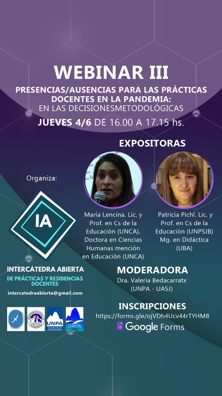 Bajo el título: “Presencias/ausencias para las prácticas docentes en la pandemia: en las decisiones metodológicas, hoy a partir de las 16 hs. se realizará una nueva conferencia. “En esta ocasión nos y los desafiamos a pensar en la situación de presencias y ausencias en el marco del aislamiento. Los invitamos a co-pensar la configuración de dispositivos didácticos de residencias y prácticas docentes en un aquí y ahora tan excepcional, que necesita que repensemos las prácticas y nos pensemos como sujetos virtualizados involucrados en procesos de formación”. Como expositoras además de Lencina, estará la profesora Patricia Pichl de la UBA.