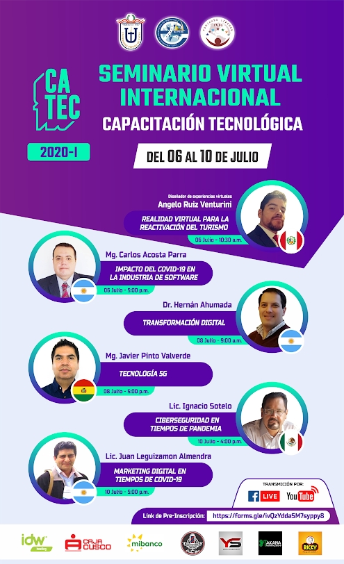 Teniendo como principal destinataria a toda la comunidad interesada en la tecnología, se realizará seis ponencias de modalidad virtual, con una duración aproximada de 3 días del 6 al 10 de julio, para lo cual, se contará con distinguidos profesionales de reconocida trayectoria internacional para el desarrollo de los temas seleccionados.