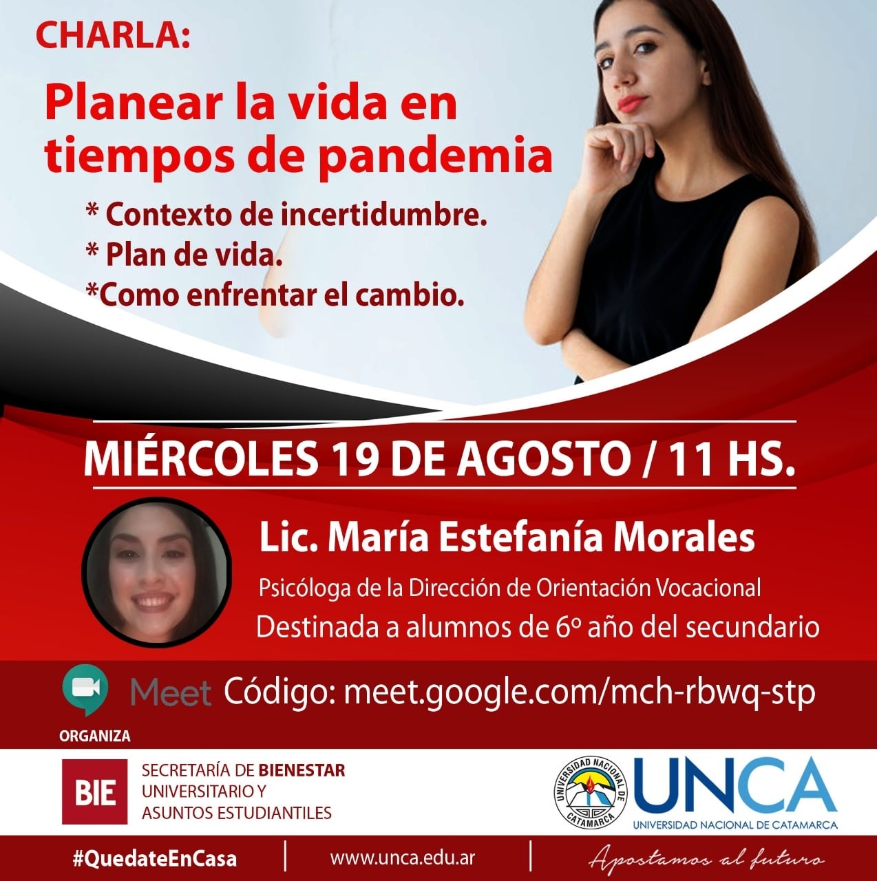La Lic. María Estefanía Morales, psicóloga de Orientación Vocacional disertará sobre los ejes de Contexto de incertidumbre, Plan de vida y Cómo enfrentar el cambio.