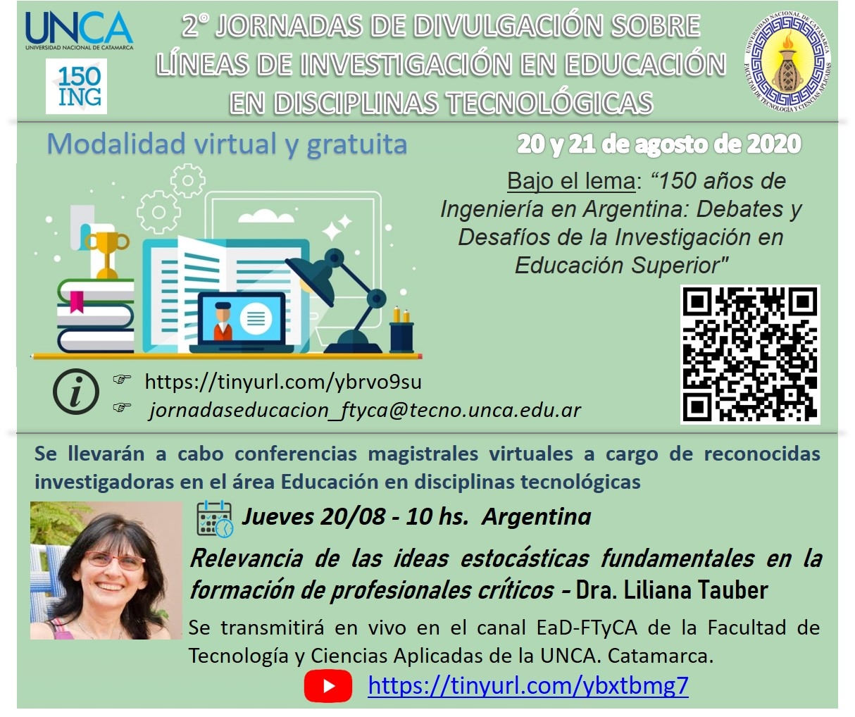 Está previsto conferencias magistrales virtuales a cargo de reconocidas investigadoras en el área educación en disciplinas tecnológicas. El jueves 20, a las 10, a continuación del acto inaugural, la Dra. Liliana Tauber tendrá a su cargo “Relevancia de las ideas estocásticas fundamentales en la formación de profesionales críticos”. Al día siguiente, viernes 21, a las 10, la Dra. Mabel Rodríguez expondrá sobre “Cuestiones metodológicas para la investigación en educación en disciplinas tecnológicas”.