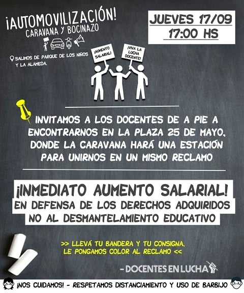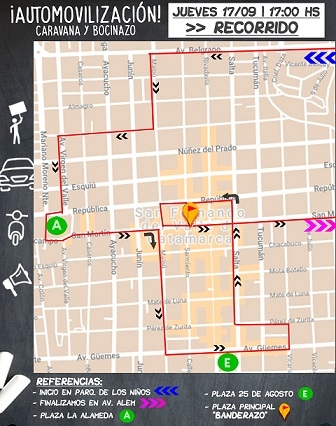 La automovilización partirá desde plaza La Alameda y del Parque los Niños, y concluirá en Plaza 25 Mayo, frente a Casa de Gobierno donde harán escuchar su reclamo.