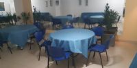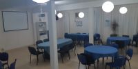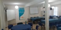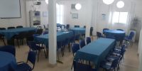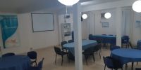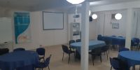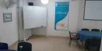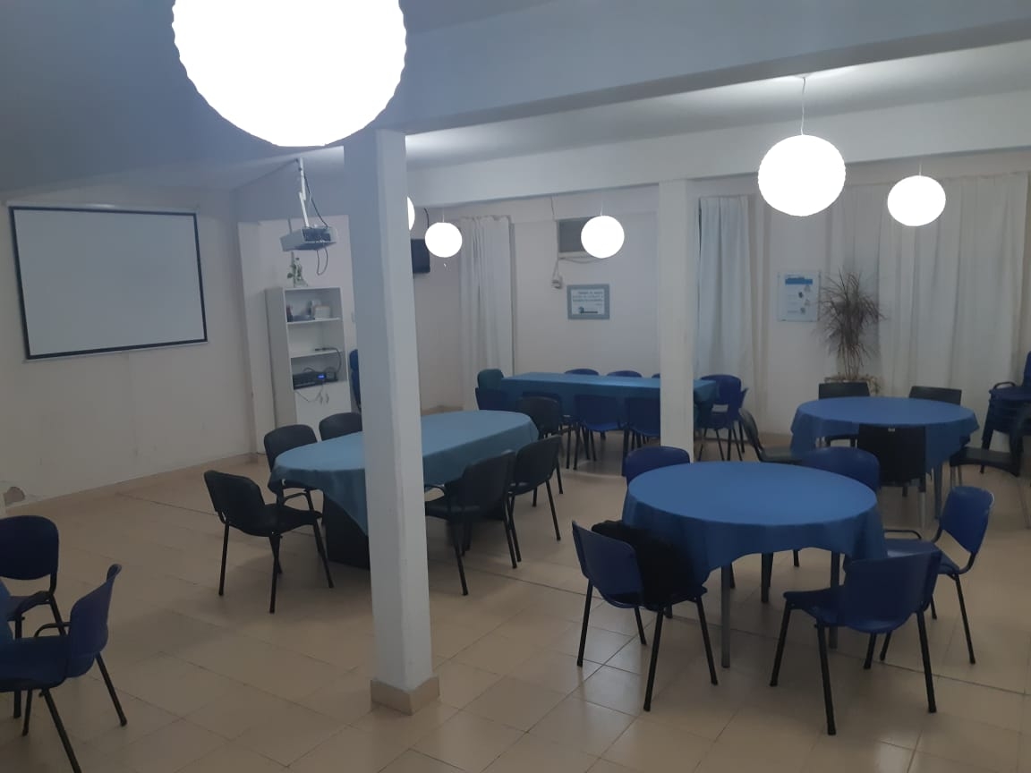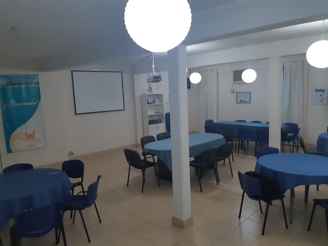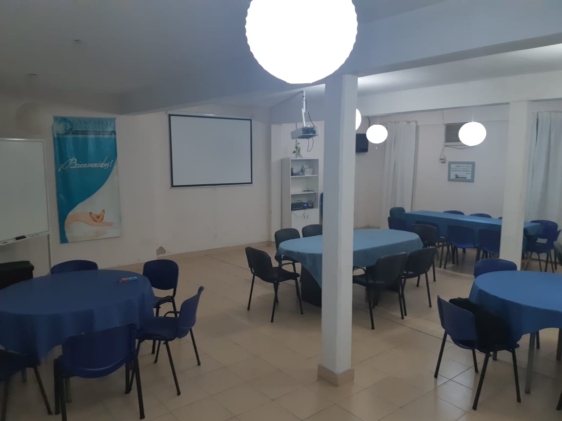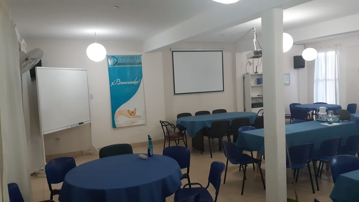 Equipo de sonido, cañón, mesas, sillas, pizarra.