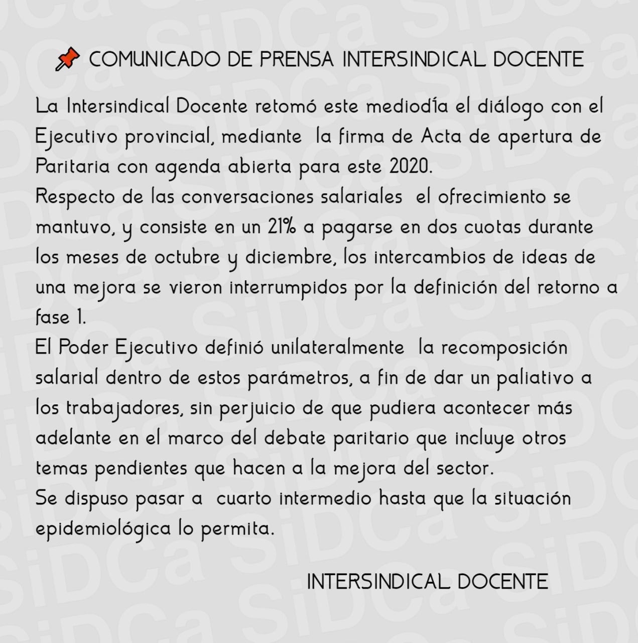 Según indicaron los gremios a través de un comunicado, el incremento resuelto de manera "unilateral" por el Gobierno, será un paliativo sin perjuicio de que más adelante se mejoren otros aspectos relacionado al haber docente.