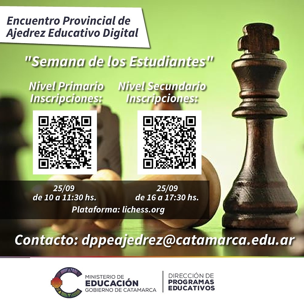 El Ministerio de Educación a través del Programa Ajedrez Educativo dependiente de la Dirección de Programas de Educativos realizará mañana de manera virtual, el Encuentro Provincial de Ajedrez Educativo Digital “Semana de los Estudiantes”, destinado a alumnos de los niveles primario y secundario de la provincia.
