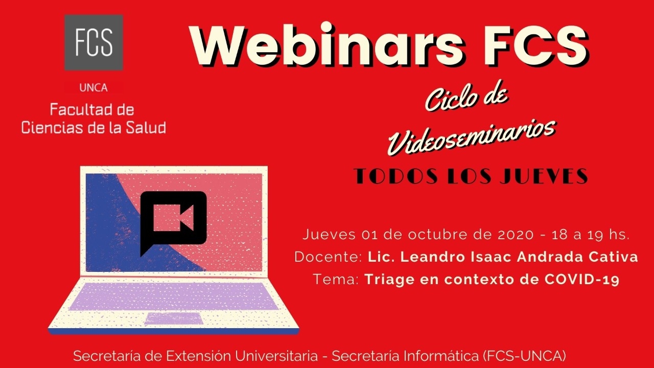 El primer seminario web estará a cargo del Lic. Leandro Isaac Andrada Cativa, Docente de la Carrera Licenciatura en Enfermería de la FCS y el tema a desarrollar será, "TRIAGE EN CONTEXTO DE COVID-19".