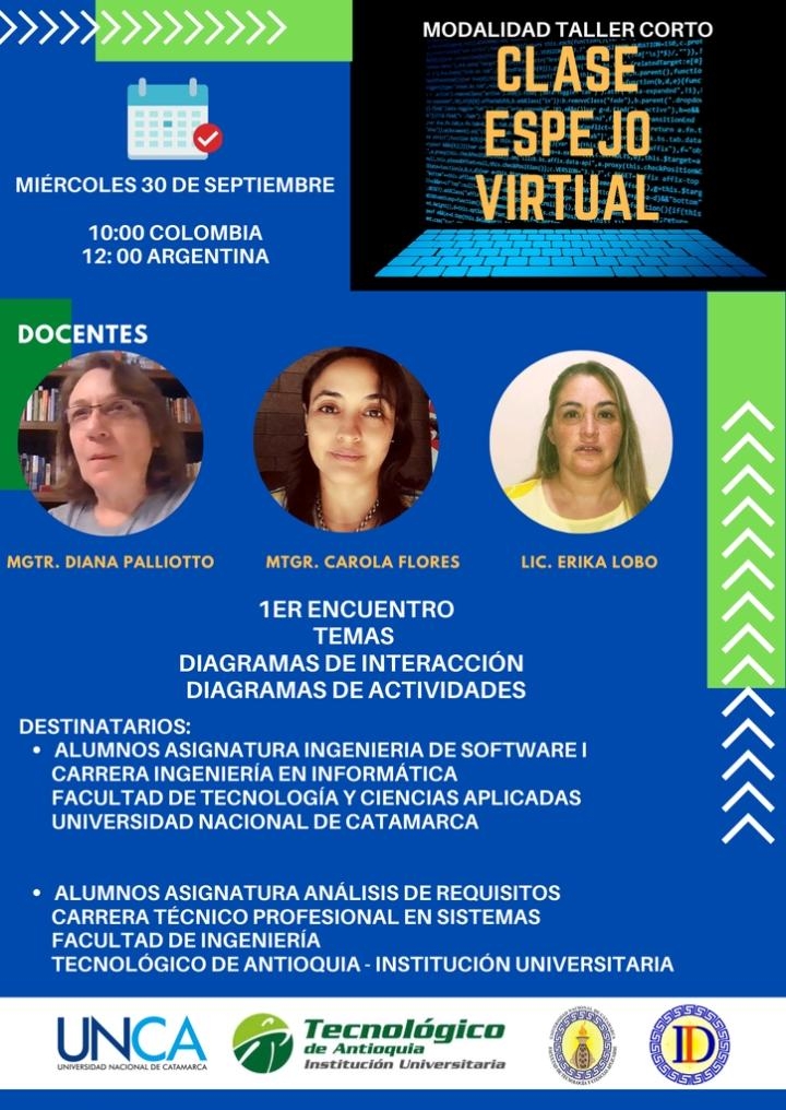 En el primer encuentro a celebrarse hoy, a las 16 (Colombia), a las 18 en Argentina, está previsto el tema Diagramas de interacción y diagramas de actividades. Será un taller corto que tendrá como docentes a la Mgter Diana Palliotto, Mgter. Carola Flores y Lic. Erika Lobo.