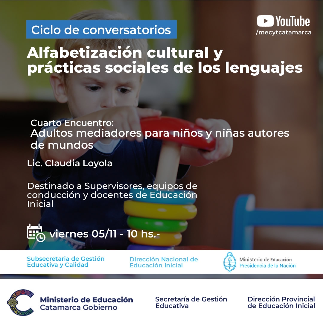 En esta oportunidad, se contará con la participación de la Lic. Claudia Loyola, quien disertará sobre adultos mediadores para niños y niñas autores de mundos. El ciclo está destinado a supervisores, equipos de conducción y docentes de educación inicial.
