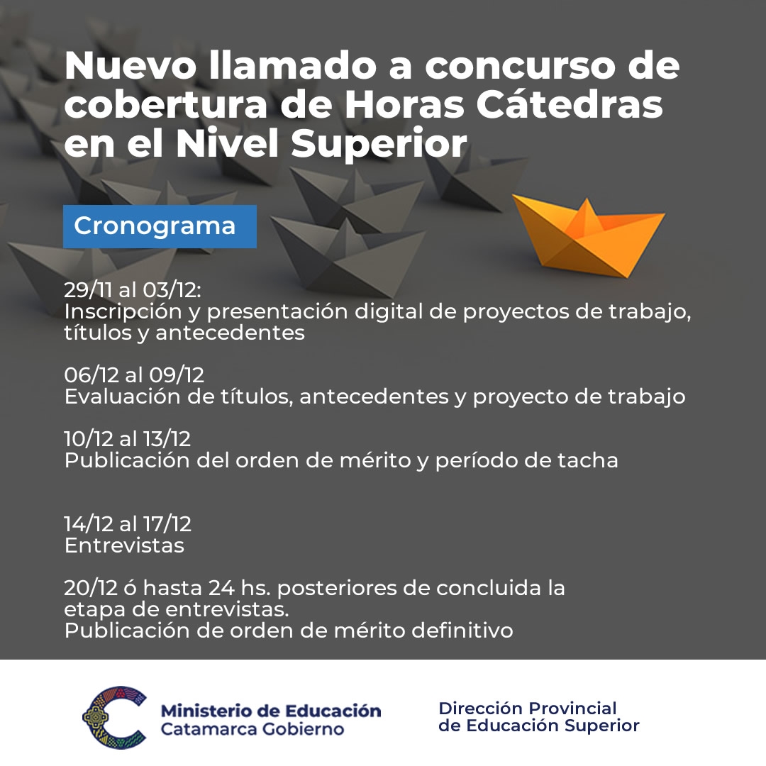 El cronograma de esta nueva Convocatoria a Concurso para Espacios Curriculares Interinos y Suplentes en el Nivel Superior es el siguiente: