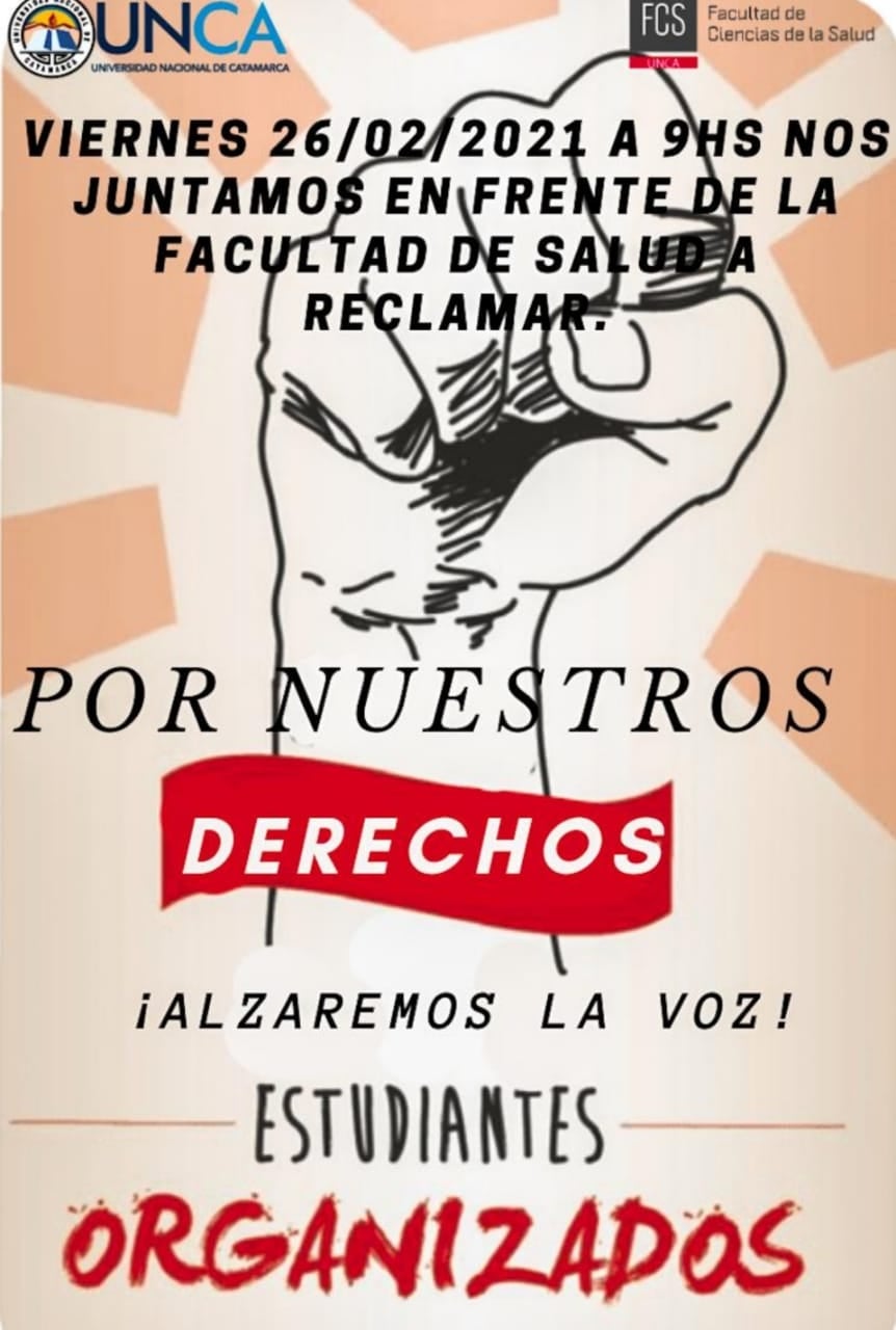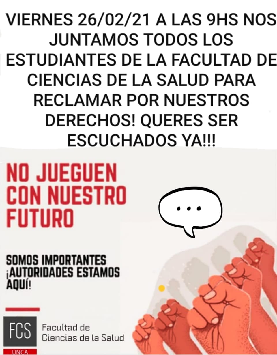 Nos hacemos presentes alumnos de la Facultad de Ciencias de la Salud de la UNCA para hacernos escuchar y que se nos respete. No podemos, ni aceptamos como alumnos culpar a la pandemia de una mala gestión de años. Queremos soluciones viables, reales, para alumnos que están en la ciudad capital y en el interior.