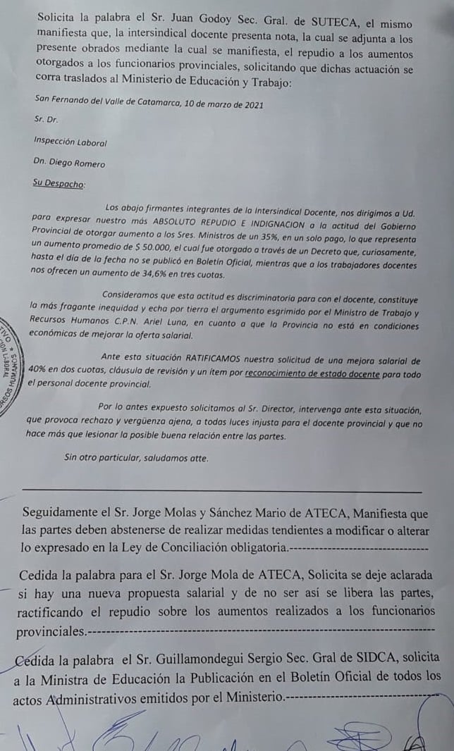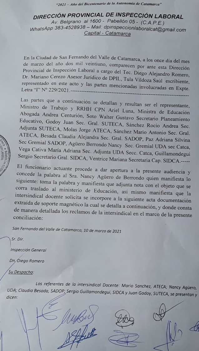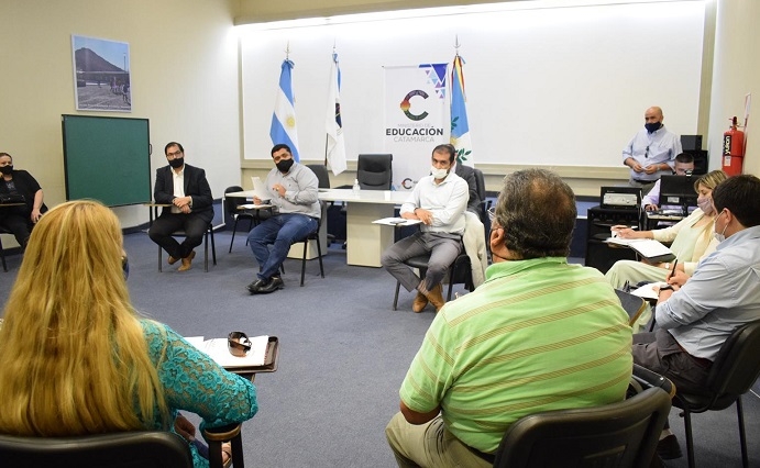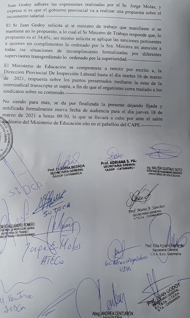 De la reunión participaron la ministra de Educación, Andrea Centurión, su par de Trabajo y Recursos Humanos, Ariel Luna, el secretario de Planeamiento Educativo, Gustavo Soto, y los representantes gremiales Jorge Molas y Mario Sánchez de ATECa, Sergio Guillamondegui y Mariana Ventrice de SIDCa, Nancy Agüero y María Vega Cativa de UDA, Claudia Besada y Adriana Silvina Paz de SADOP, y Andrea Sánchez de SUTECa.