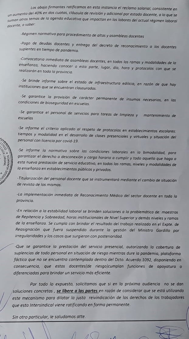 En el encuentro, los gremialistas formalizaron, además, otros reclamos al Ministerio de Educación que impactan en el actual régimen laboral. Seguidamente, requirieron que si en la próxima reunión no existen respuestas favorables a esos planteos, "se liberen las partes en razón de que se está utilizado este mecanismo para dilatar la justa reivindicación de los derechos de los trabajadores".