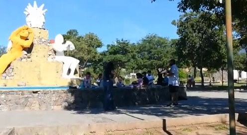 Según publica Radio Valle Viejo, los docentes Diana y Marcos, desde temprano y con todas las precauciones sanitarias, se reunieron a la vuelta de la fuente de la Plaza Huayra Tawa para dictarles clases de Lengua y Matemática a los pequeños alumnos.