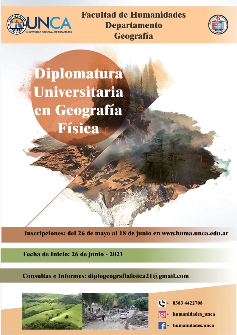 Esta diplomatura, aplicada al Clima, Hidrografía, Geomorfología y Riesgos, está dirigida a Profesores y Licenciado en Geografía interesados en ampliar conocimientos acerca de la utilización de la Geografía Física aplicada a la gestión del paisaje y su abordaje en la enseñanza y la investigación. Comenzará a dictarse el 26 de junio de este año.
