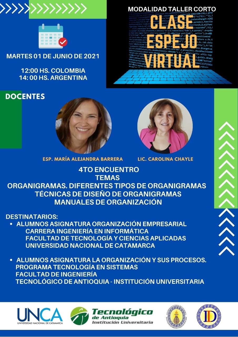 Una de ellas está referida a la realización de clases espejo virtual entre ambas instituciones, que tuvo continuidad este año con la cátedra “Organización empresarial” de la carrera Ingeniería en Informática de Facultad de Tecnología y Ciencias Aplicadas de la UNCA y la cátedra “La organización y sus procesos del programa tecnología en sistemas” de la Facultad de Ingeniería del Tecnológico de Antioquia.
