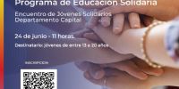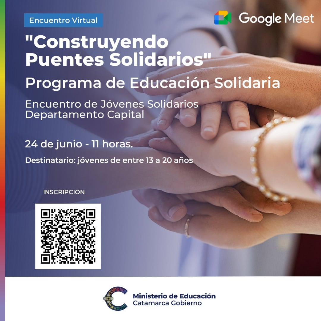Este jueves el Ministerio de Educación pone en marcha el Programa Educación Solidaria que depende de la Dirección de Programas Educativos con un Encuentro denominado “Construyendo Puentes Solidarios" se realizará este jueves 24 de junio, a las 11, por google Meet y está destinado a jóvenes de entre 13 a 20 años del departamento Capital.