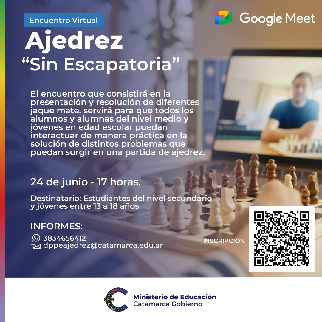 Además, el Programa de Ajedrez Educativo invita a participar de un encuentro que consistirá en la presentación y resolución de diferentes “jaque mate”, como práctica para que todos los alumnos y alumnas del nivel medio y jóvenes en edad escolar puedan interactuar de manera práctica en la solución de distintos problemas que puedan surgir en una partida de ajedrez.