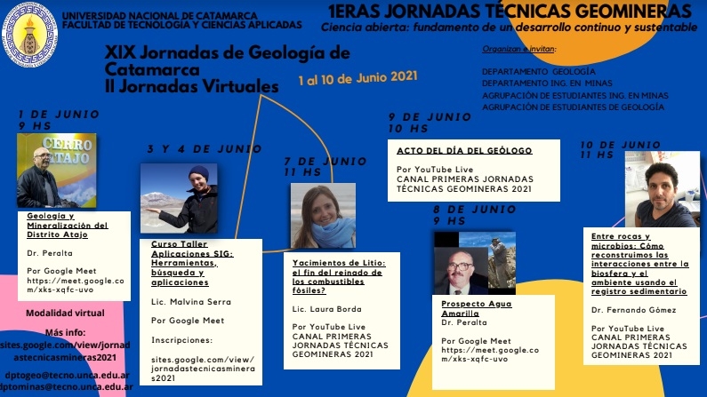 Con el lema “Conectados con la Tierra”, el programa de actividades -a llevarse a cabo de manera íntegra en modalidad virtual- comenzó el martes pasado y concluirá el 10 del corriente, organizado por la Facultad de Tecnología y Ciencias Aplicadas de la Universidad Nacional de Catamarca(UNCA), el Colegio de Geólogos de Catamarca y la Agrupación de Estudiantes de Geología.