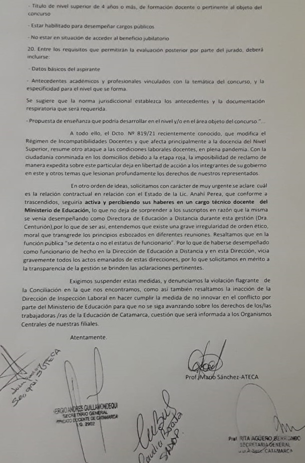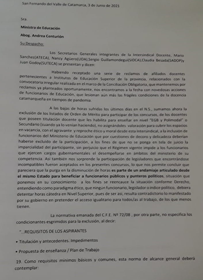 En este sentido, mencionan la inclusión de funcionarios del Ministerio de Educación y de legisladores en las mismas convocatorias para cargos quienes “fueron aceptados en los presentes concursos”. "Esto nos permite concluir que pareciera que la purga en la disminución de horas es parte de un andamiaje articulado desde el Estado para beneficiar a funcionarios públicos y punteros políticos”.