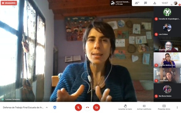 A la defensa virtual asistieron docentes, estudiantes, no docentes, familiares y amigos de la egresada. El tribunal estuvo integrado por los docentes de la Escuela de Arqueología, Alejandro Fabio Haber, Ángeles Molina Pico, Laura Romina Roda; y como suplente Enrique Alejandro Moreno.
