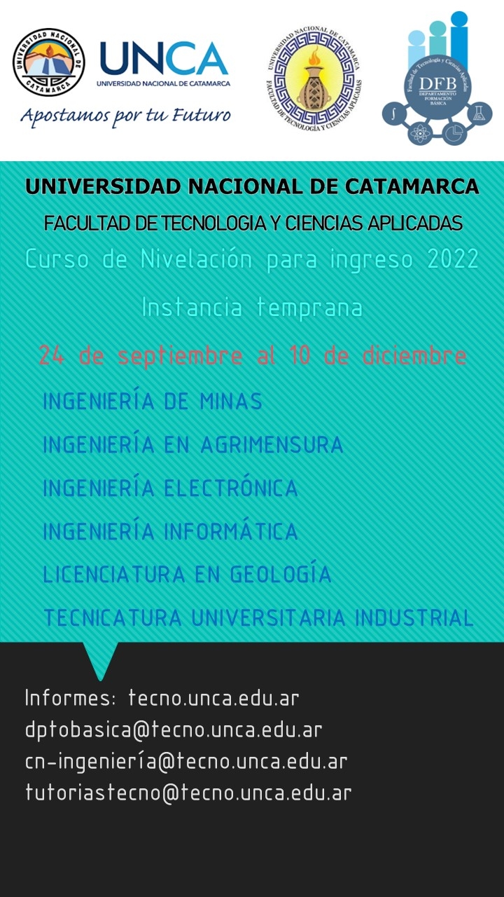Según se informó oficialmente, se organiza el curso de nivelación adelantado para las siguientes carreras de grado y pregrado de la sede Capital: Ingeniería de Minas, Ingeniería en Agrimensura, Ingeniería Electrónica, Ingeniería Informática, Licenciatura en Geología y Tecnicatura Universitaria Industrial.