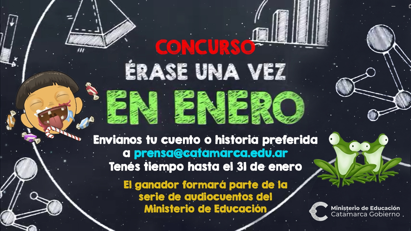El Ministerio de Educación invita a niños, jóvenes y adultos a participar del concurso “Érase una vez en enero”, el cual consiste en que los participantes envíen su cuento preferido, el de su niñez, el que marcó su infancia, cuentos típicos locales o narraciones tradicionales de Catamarca. El relato ganador será grabado a través de un audiocuento y publicado en las plataformas digitales que posee el Ministerio de Educación de la provincia.