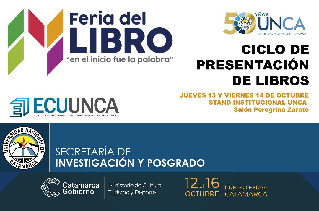La Universidad Nacional de Catamarca se encuentra festejando sus primeros 50 años de vida y también de esta manera y durante estos días estará dedicada a mostrar su producción editorial junto a las demás editoriales que integran la industria editorial catamarqueña, para ello ha preparado un programa de presentación de libros por parte de la Editorial Científica Universitaria que depende de la Secretaría de Investigación y Posgrado, dichas presentaciones se realizarán en un espacio destinado a ello en el Stand mismo de la UNCA que se ubica en la Sala Peregrina Zárate.